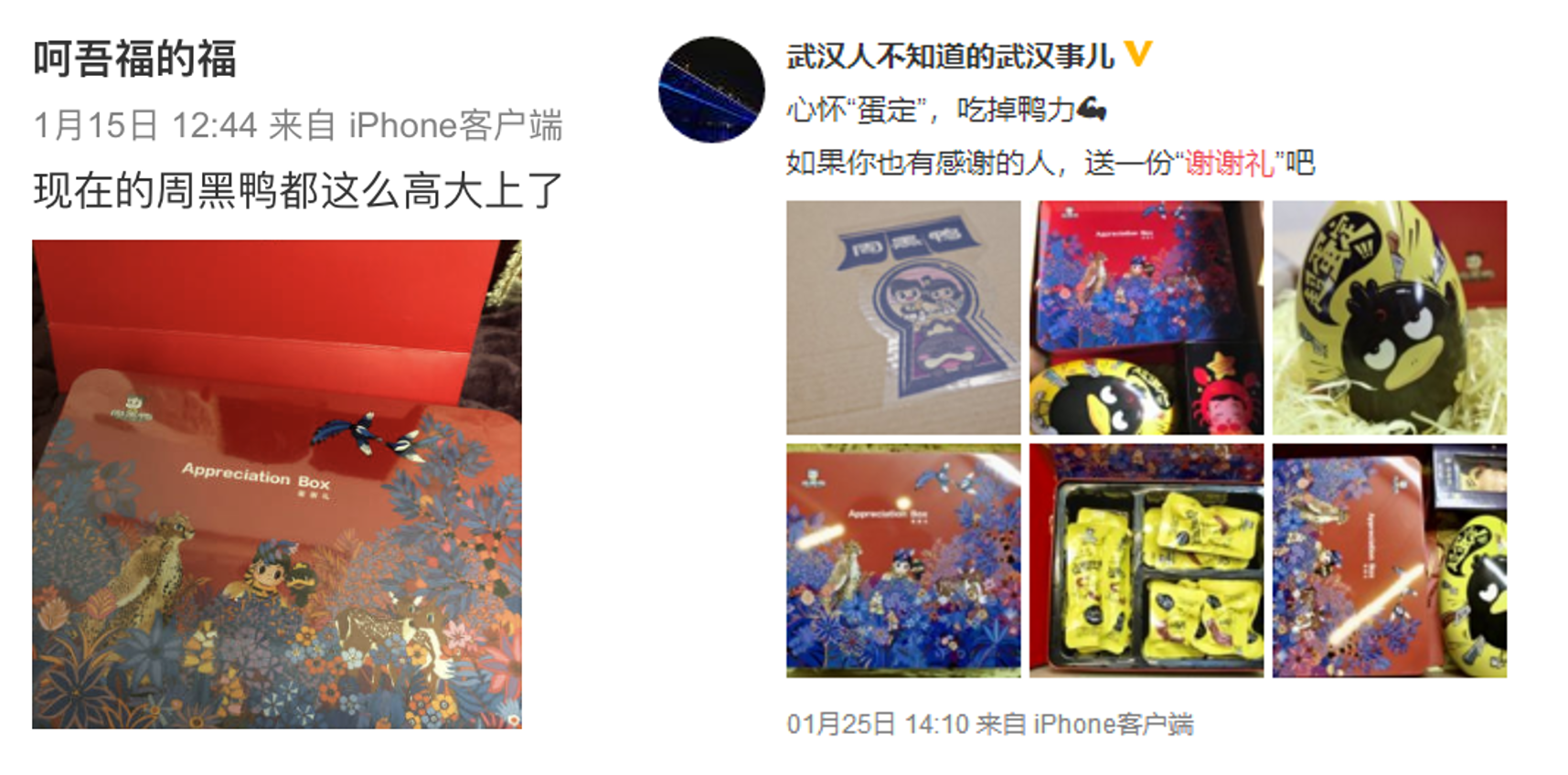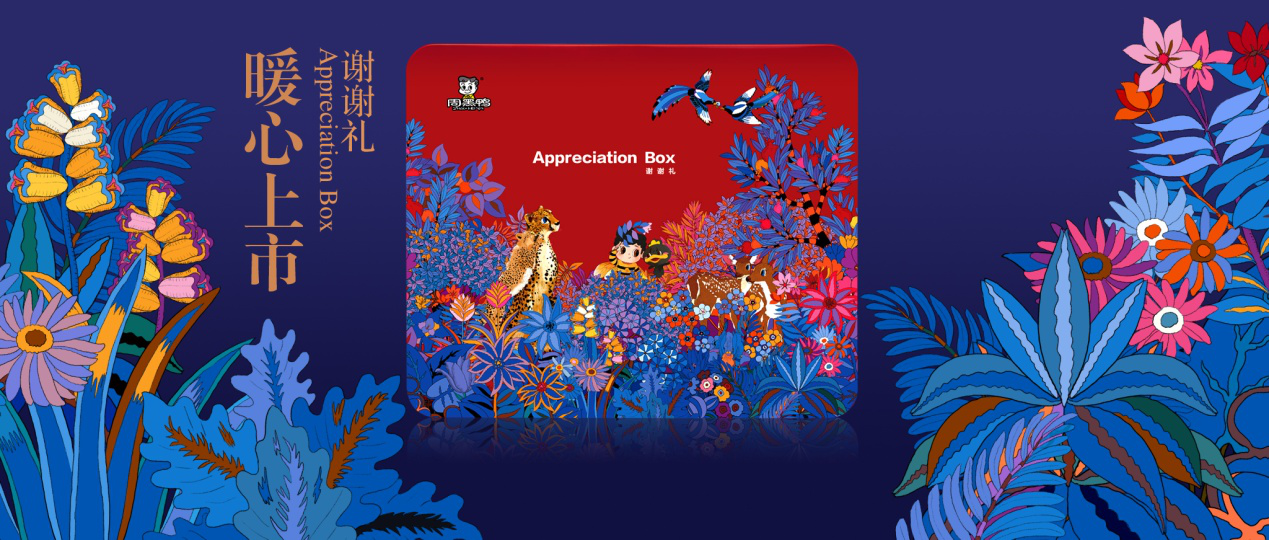 畫面中一大一小的兩只豹子、親密無間的梅花鹿和相互嬉戲的喜鵲分別代表了親情、友情和愛情。除了借由禮盒對朋友表達(dá)感謝之情外,同樣還可以贈送給親人和愛人。正中是代表品牌的卡通人物和鴨子,蘊意無論何種關(guān)系,作為傳情達(dá)意的載體,都可以是周黑鴨“謝謝禮”禮盒